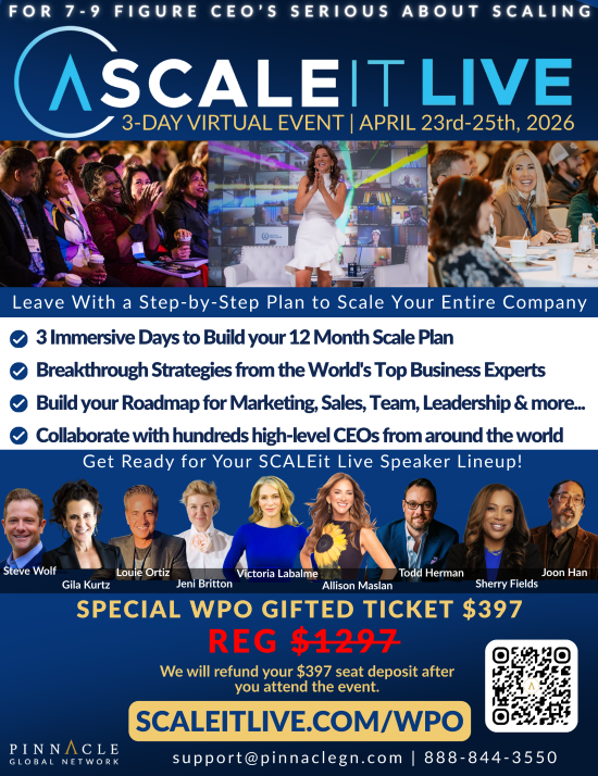 SCALEIt Live! is a 3-day live virtual experience from Pinnacle Global Network where established CEOs build the structure and scale plan required to multiply growth and create a team-managed company. A special offer is available for WPO Members interested in attending. Click on the Learn More link for more details.